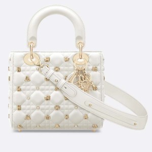 - Sleek and refined, the creation is timeless. Constructed in latte Cannage lambskin, the bag is accented by gold-tone resin pearls and gold-finish zodiac sign studs.