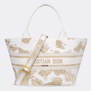 - Fully embroidered with a white and gold-tone Gradient Butterflies motif, it showcases a kaleidoscope of butterflies in a gradient effect and is enhanced by a Christian Dior Paris signature on the front. Equipped with a tonal detachable zipped pouch, the spacious bag is completed with an adjustable and removable embroidered strap, allowing it to be carried by hand, worn over the shoulder or crossbody.