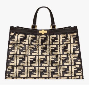 - Large Peekaboo X-tote bag, made of raffia with beige FF motif on a black background, finished with black leather edges and decorated with the classic twist lock.
