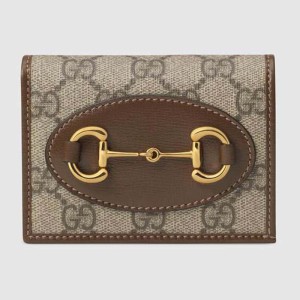 - Introduced within the Gucci 1955 Horsebit accessories collection for Spring Summer 2020, the card case wallet is presented in GG Supreme canvas and brown leather.