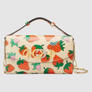 - Presented on ivory leather, the Gucci Strawberry print walked the Spring Summer 2019 runway, evoking a vintage ’70s feel. Shown on the small shoulder bag, it’s contrasted with the Interlocking G Horsebit in a modern mix of silver and gold tones.