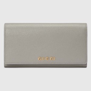 - Presented in light grey leather, the continental wallet is completed by a gold-toned Gucci script detail.