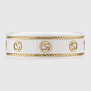 - The Interlocking G, presented in yellow gold, contrasts against a white zirconia band.