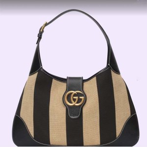 - This new crescent-shaped shoulder bag was shown on the runway and was inspired by the House’s archives, it is crafted in striped cotton canvas and features the Double G emblem—a code originally introduced in the 1970s.