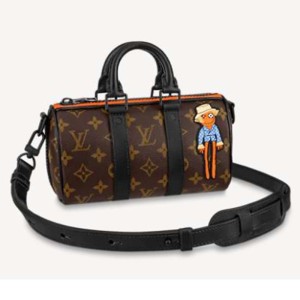 - The classic Louis Vuitton look is enlivened with a touch of florescent orange along the zipper and an embroidered patch of a cartoon LV friend from Virgil Abloh’s “Zoom with friends” animated film.
