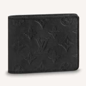 - Black Monogram Shadow calfskin, a very supple leather embossed with the iconic Monogram pattern, complements the neat design of Louis Vuitton’s Multiple wallet.