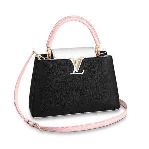 - The dominant black of the bag is contrasted with a white flap and a light pink handle and strap. As with all Capucines, the flap can be worn inside the bag to feature the LV Initials signature or outside for a more discreet look.