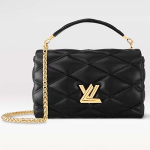 - The GO-14 GM handbag is made from quilted lambskin with gold-color hardware, including the golden LV Twist lock on the flap.